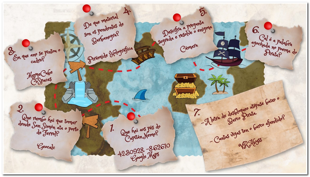 Arrrrrggg! Grumetes!!! Vides preparados para vivir unha verdadeira aventura pirata? Pois teredes que poñer en funcionamento as vosas habilidades se queredes descubrir a resposta de todos estes enigmas, nos que unha morea de aplicacións e diversos elementos tecnolóxicos axudaranvos a achar as solucións correctas.